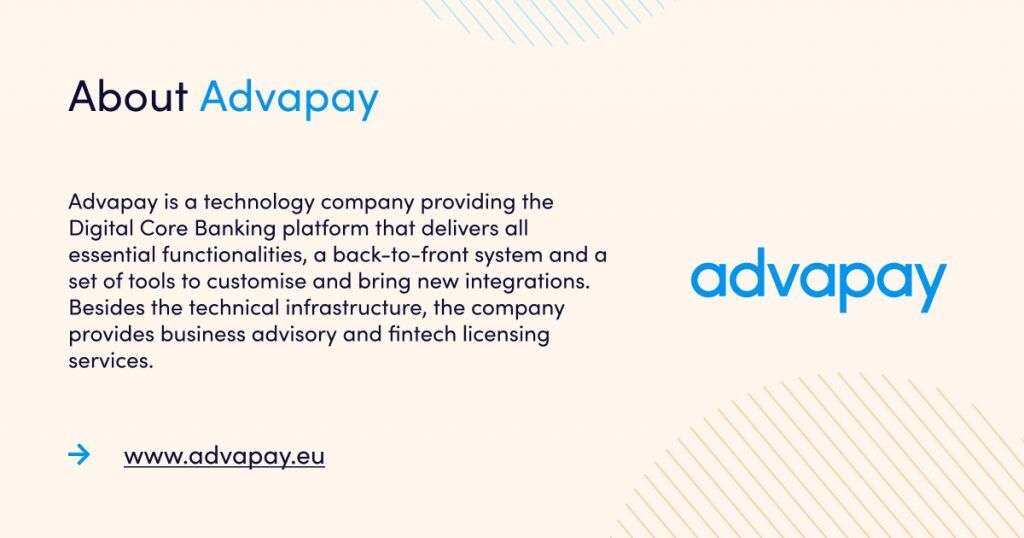 Advapay is a technology company providing the Digital Core Banking platform to empower fintech clients or digital banks to start their businesses and accelerate digital transformation. The platform delivers all essential functionalities, a front-to-back system and a set of tools to customise and bring new integrations. With Advapay, potential and existing customers can connect either to the cloud-based SaaS or on-premise software. Besides the technical infrastructure, the company provides business advisory and fintech licensing services. Interested to learn more, please drop us a message